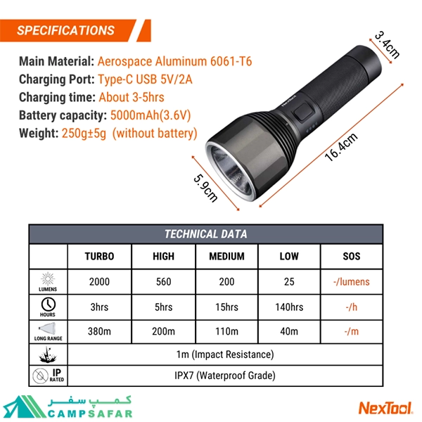 استاندارد IPX7 (تحمل غوطهوری 1 متری تا 30 دقیقه) ,برند NexTool (زیرمجموعه شیائومی) ,مجهز به چیپ پیشرفته CREE XHP50.2 ,مقاومت در برابر ضربه از ارتفاع 1 متر ,نوع شارژ درگاه USB Type-C با ورودی 5V/2A |